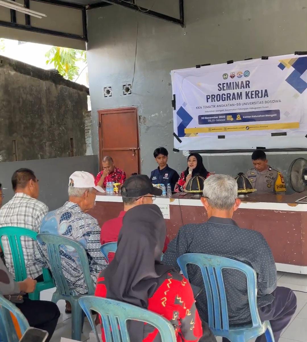 Pelaksanaan seminar program kerja KKN Tematik Angkatan 59 Universitas Bosowa bersama masyarakat dan aparat setempat sebagai sarana pemaparan rencana kegiatan serta penyerapan aspirasi warga.